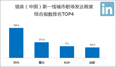 杭州在新一線城市職場發達綜合指數排名第三,其在“職業社交用戶數量”、“海外受教育比例”兩個方面遠超其他城市。杭州作為沿海輕工業發達地區,各種資源相對于其他新一線城市更為優質。領英對領英自身的數據分析發現,高科技、金融、商業服務是杭州排名靠前的幾個行業,使得杭州吸引了大批海歸人才和國內專業人才。近年來隨著創投在杭州的火熱,越來越多在大公司工作的員工辭職創業,跨行業、跨領域人才交流需求變得更加旺盛,讓杭州的職場人比其它新一線城市更愿意注冊和使用職業社交網站,這也使得杭州在“職業社交用戶數量”指標上領先于其它新一線城市。