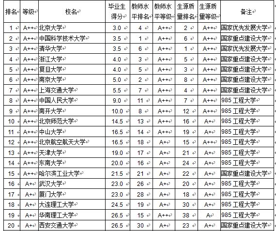 在本排行榜中,本科畢業生質量C級及以上的,列出排名和等級,C級以下的只列等級,不列排名。教師平均學術水平在B級及以上的,列出排名和等級,B級以下的只列等級,不列排名;新生錄取分數線(生源質量)在B級及以上的,列出排名和等級,B級以下的只列等級,不列排名。